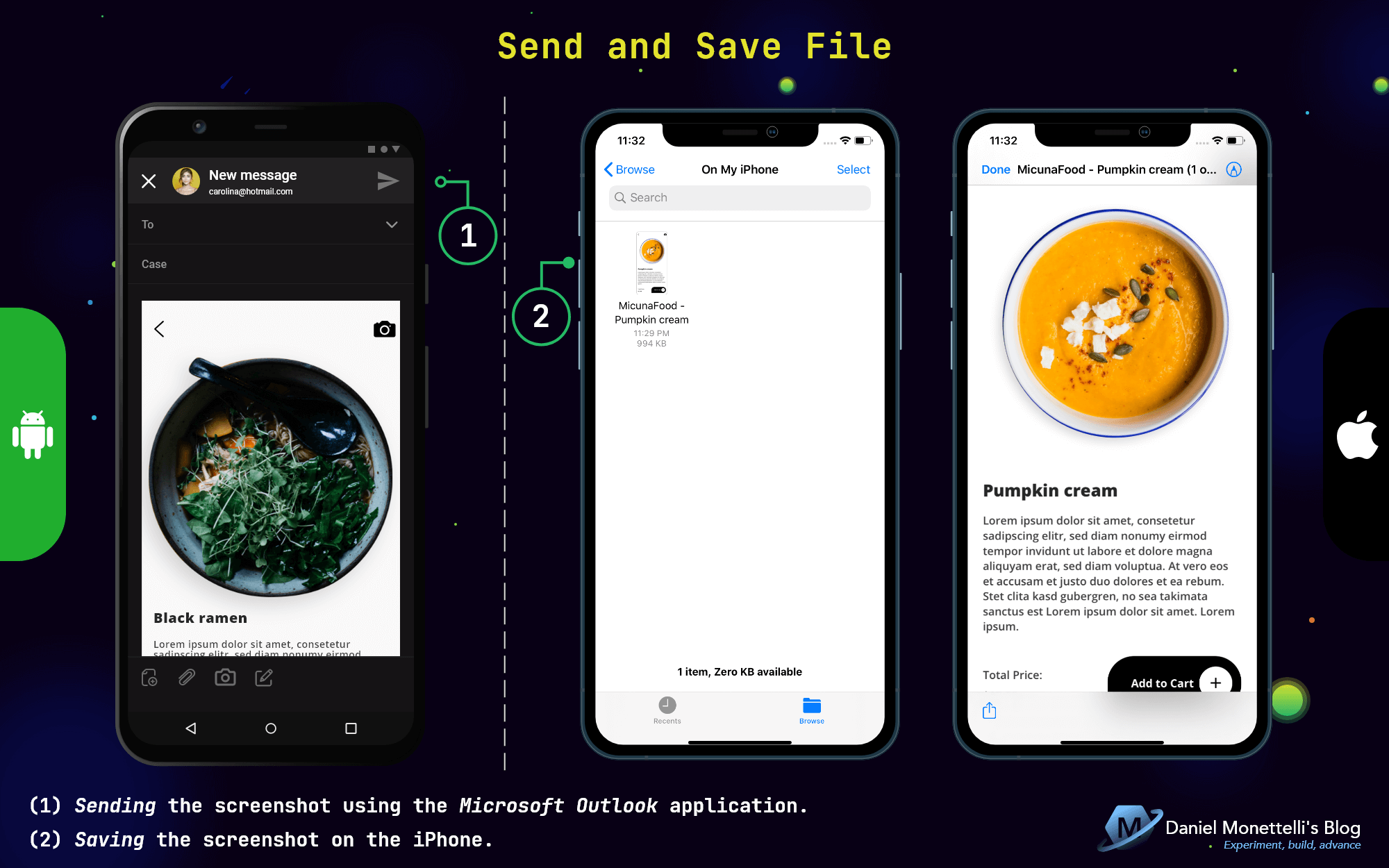 In the image above, you can see that the Android device sends the file through Microsoft Outlook application, while on the iPhone, it saves the screenshot, both ways are feasible.